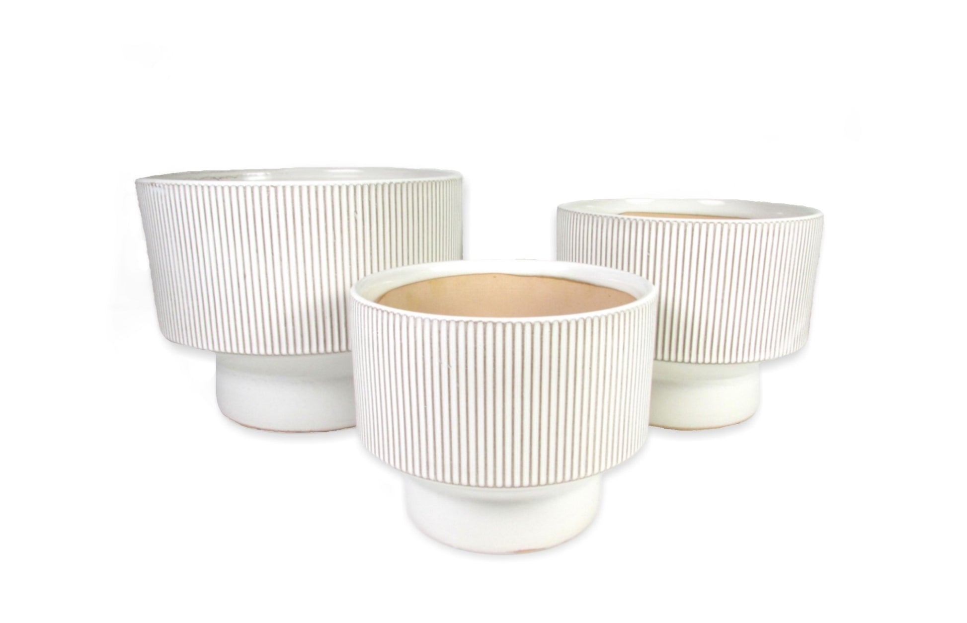 Description: CERAMIC WHITE FLUTTED POTS Size: “Inches” LG: 9 x 9.5 x 7 MED: 7.75 x 7.75 x 6.25 SM: 6.25 x 6.25 x 5.25 Inside Measurements: Length X Width X Depth Quantity Per Package: 2 Per Case Unit: Set of 3Share