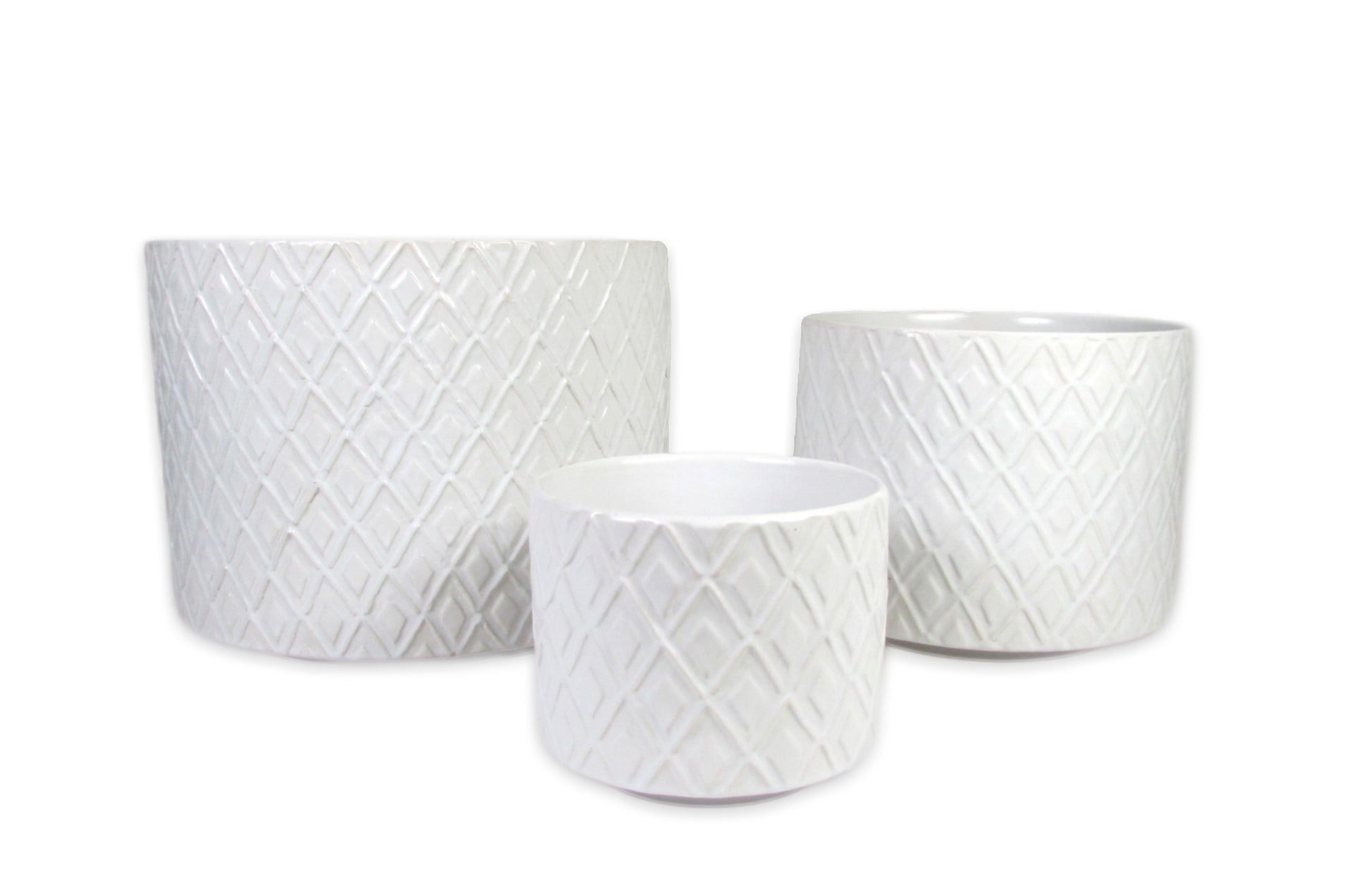 Description: CERAMIC WHITE POTS WITH DIAMOND DESIGN Size: “Inches” LG: 10 x 10 x 8 MED: 7.5 x 7.5 x 6 SM: 5 x 5 x 4 Inside Measurements: Length X Width X Depth Quantity Per Package: 2 Per Case Unit: Set of 3Share