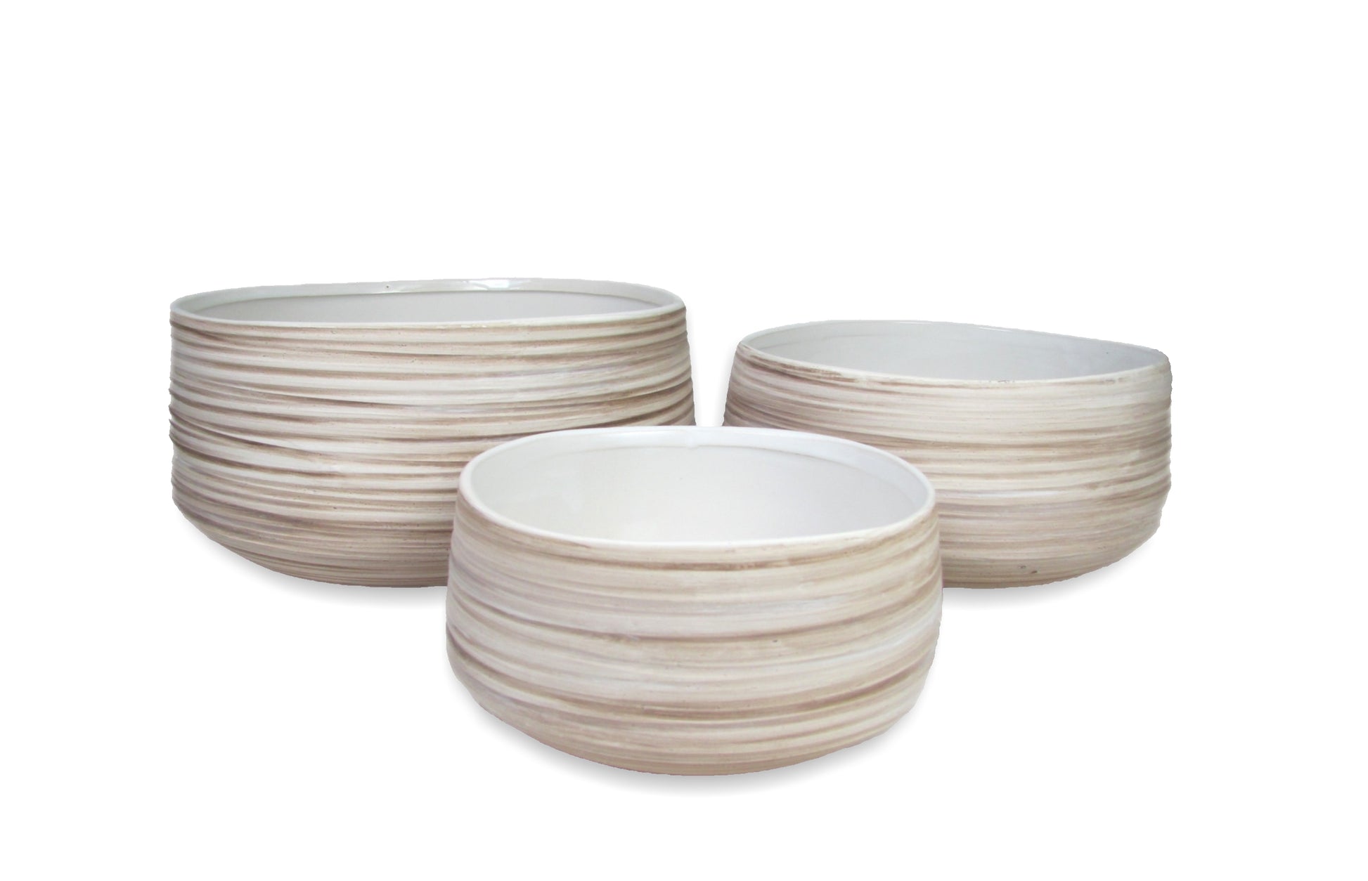 Description: CERAMIC TWO TONE COFFEE ROUND BOWLS Size: “Inches” LG: 8.50 x 8.50 x 4 MED: 7 x 7 x 3.5 SM: 5.25 x 5.25 x 2.5 Inside Measurements: Length X Width X Depth Quantity Per Package: 4 Per Case Unit: Set of 3