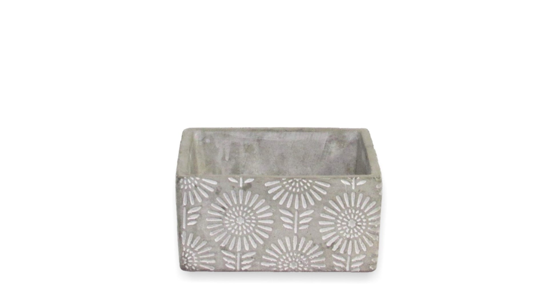 Description: Natural cement rectangle planter with flower design. Size: "Inches" 5.5 X 5.5 X 2.63 Inside Measurements: Length X Width X Depth Quantity Per Package: 12 Per Case Unit: EACHShare