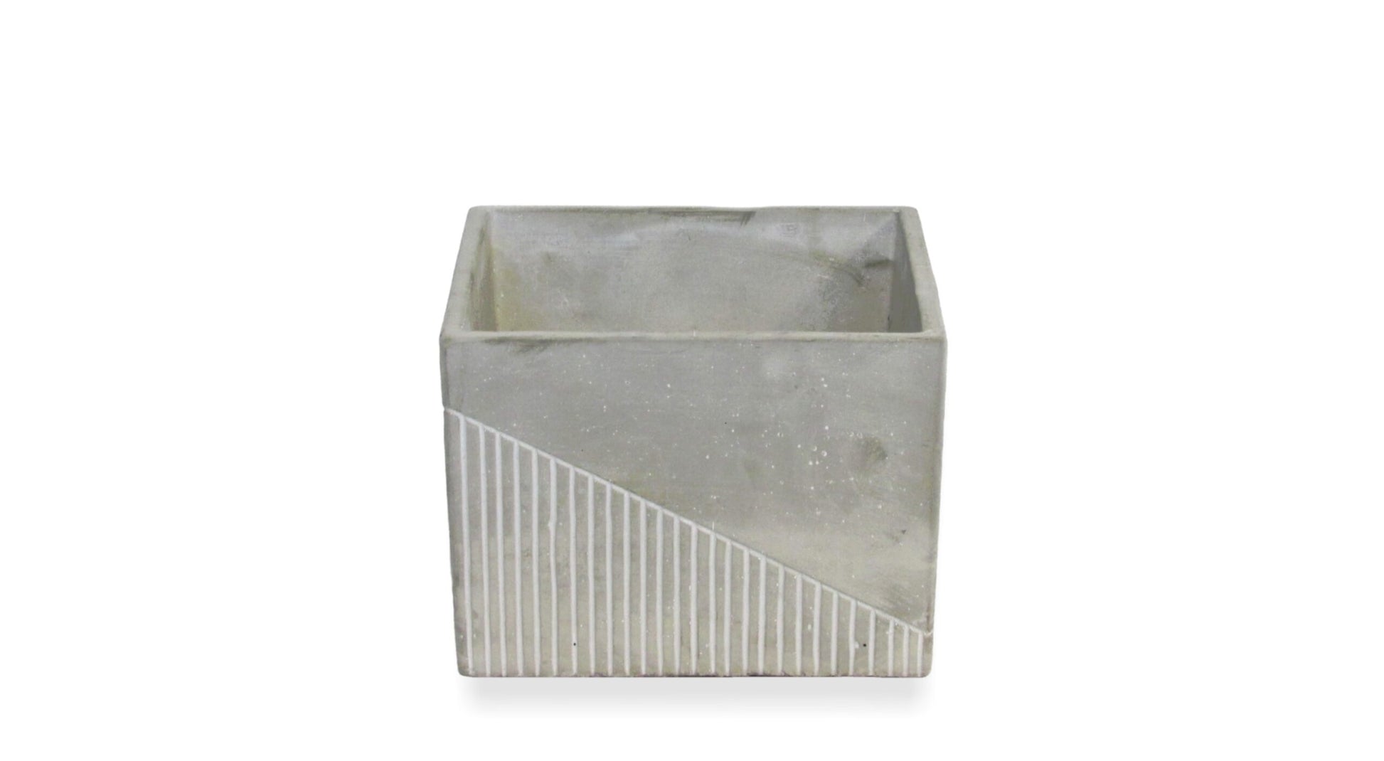 Description: Natural cement 6" square pot with line design Size: "Inches" 6.75 X 6.75 X 5 Inside Measurements: Length X Width X Depth Quantity Per Package: 6 Per Case Unit: EACHShare