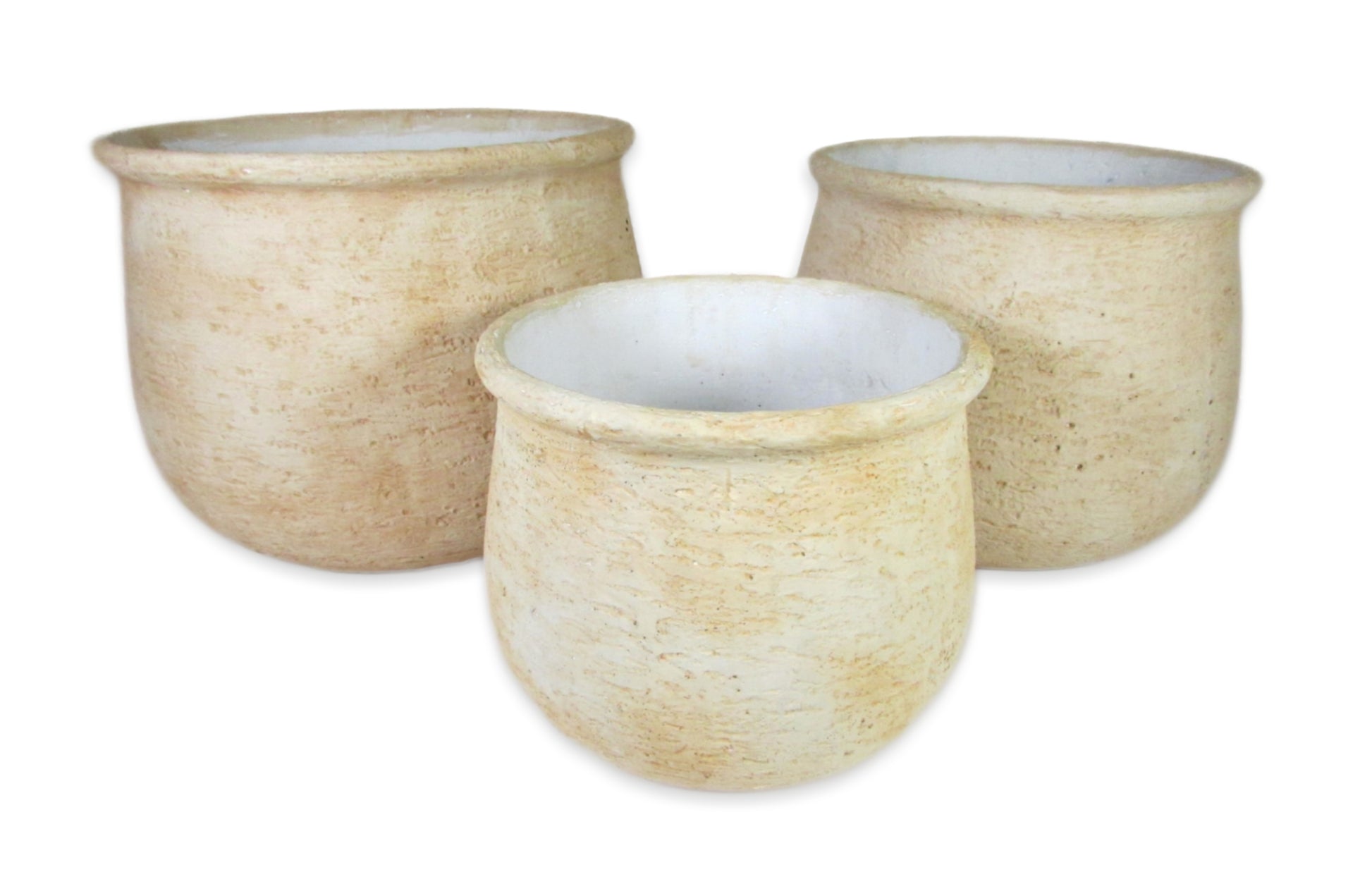 Description: CEMENT TWO TONE TAN 8", 10", 12" ROUND PLANTERS Size: “Inches” LG- 12" X 12" X 11" MED- 10.25" X 10.25" X 10" SM- 8.25" X 8.25" X 8" Inside Measurements: Length X Width X Depth X Handle Height Quantity Per Package: 1 Per Case Unit: Set of 3Share