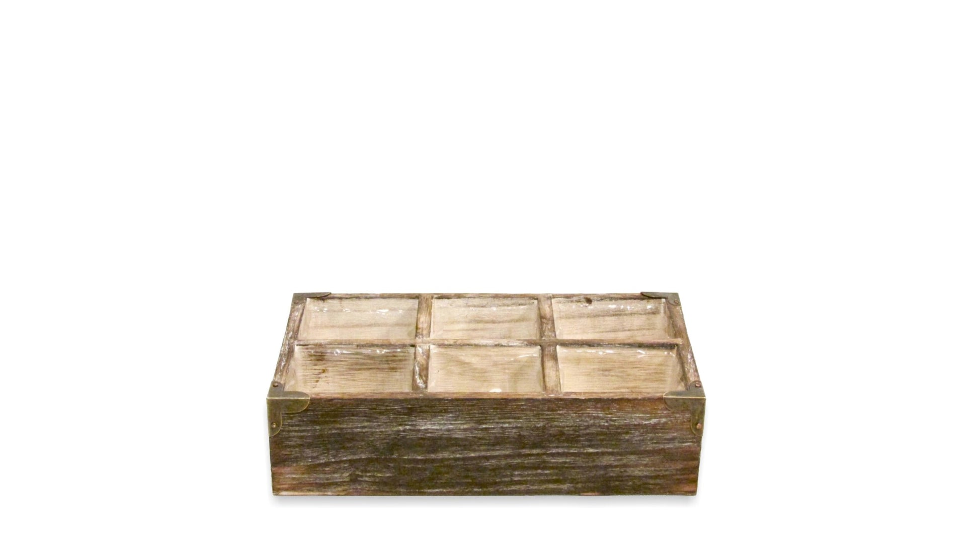 Description: Brownwash rectangle wood tray with 6 openings and metal corners; Comes with a hard liner in each square.