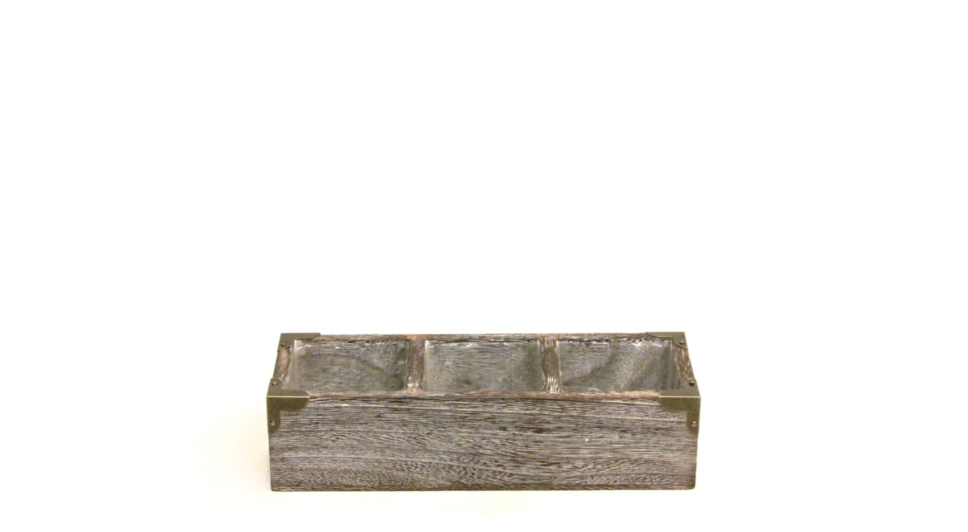 Description: Brownwash rectangular wood tray with 3 openings and metal corners; Comes with a hard liner in each square.