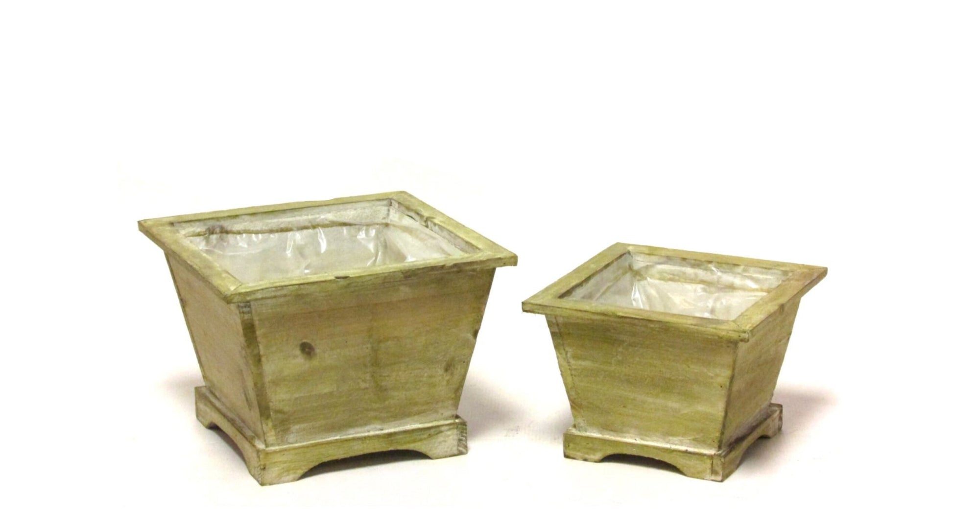 Description: Moss green/whitewash wood square pots with raised bottom.