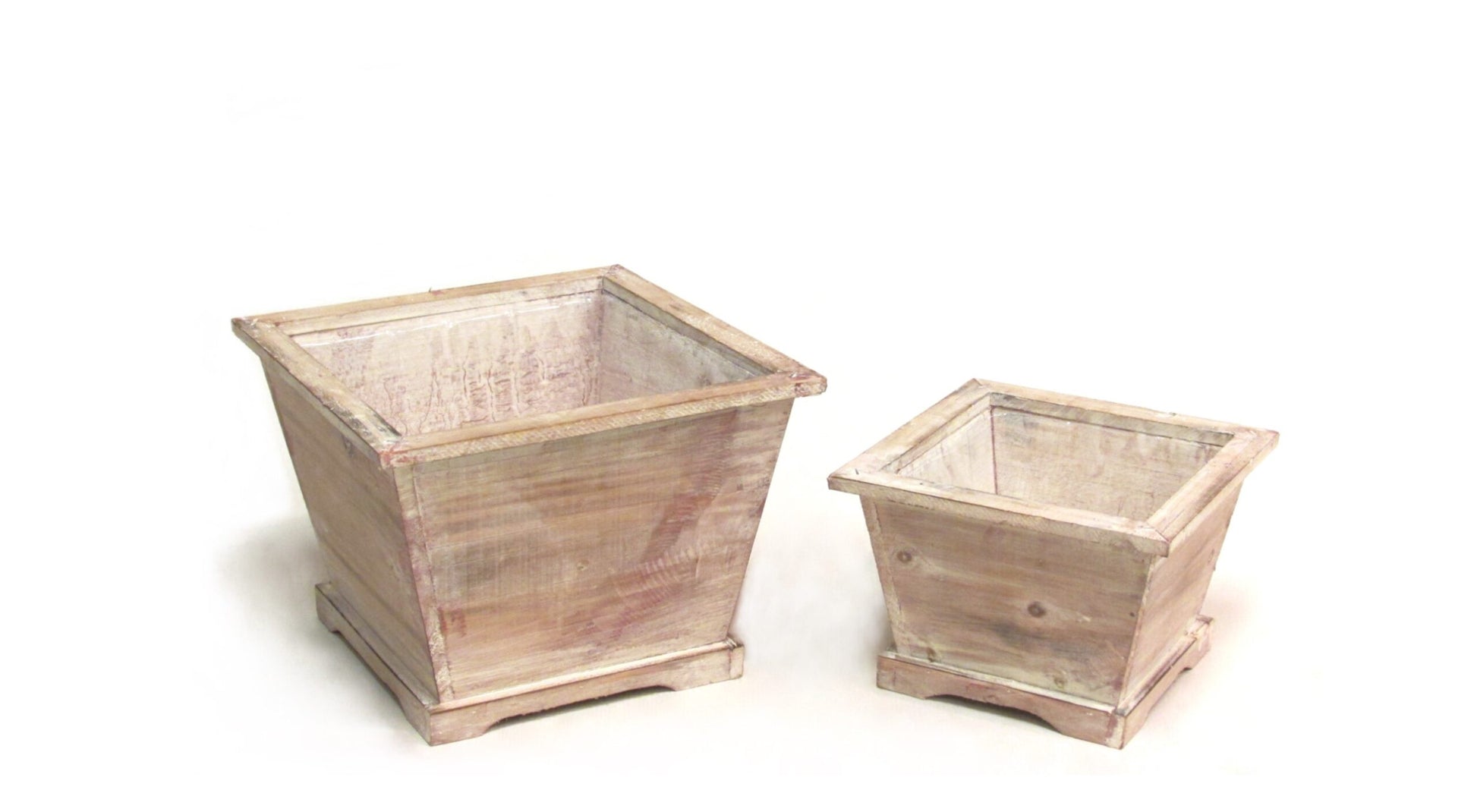 Description: Natural/whitewash wood square pot with raised bottom; Comes with hard liner.