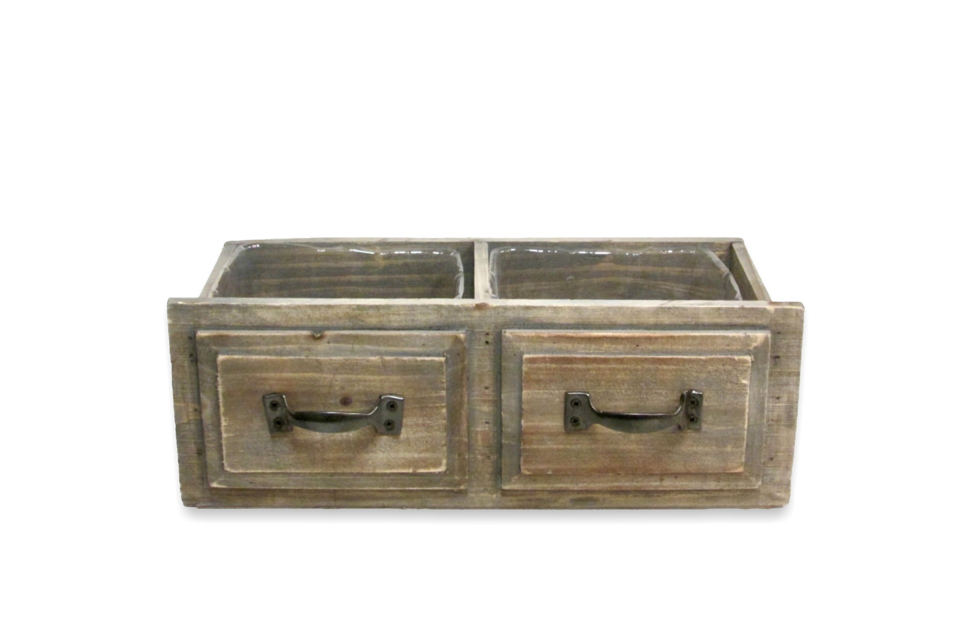 Description: Natural wood double rectangle pot with drawer design; Comes with hard liners. Size: "Inches" (2) 5.5 X 5 X 4 Inside Measurements: Length X Width X Depth Quantity Per Package: 9 Per Case Unit: EachShare