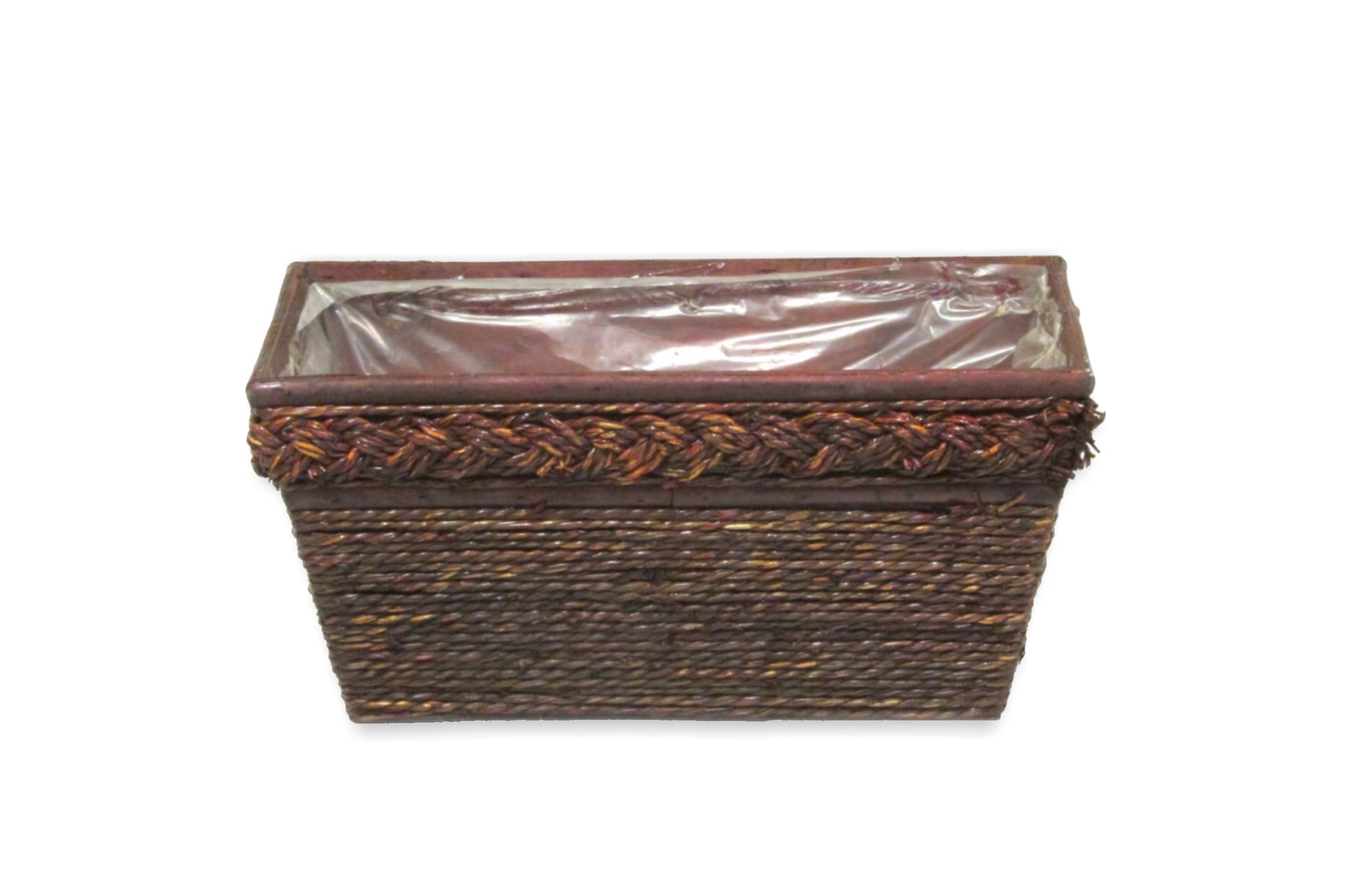 ***Soft liner only*** Description: Stained wood/rope rectangle container with braid rim. Size: "Inches" 12 X 7 X 6 Inside Measurements: Length X Width X Depth Quantity Per Package: 36 Per Case Unit: EACH
