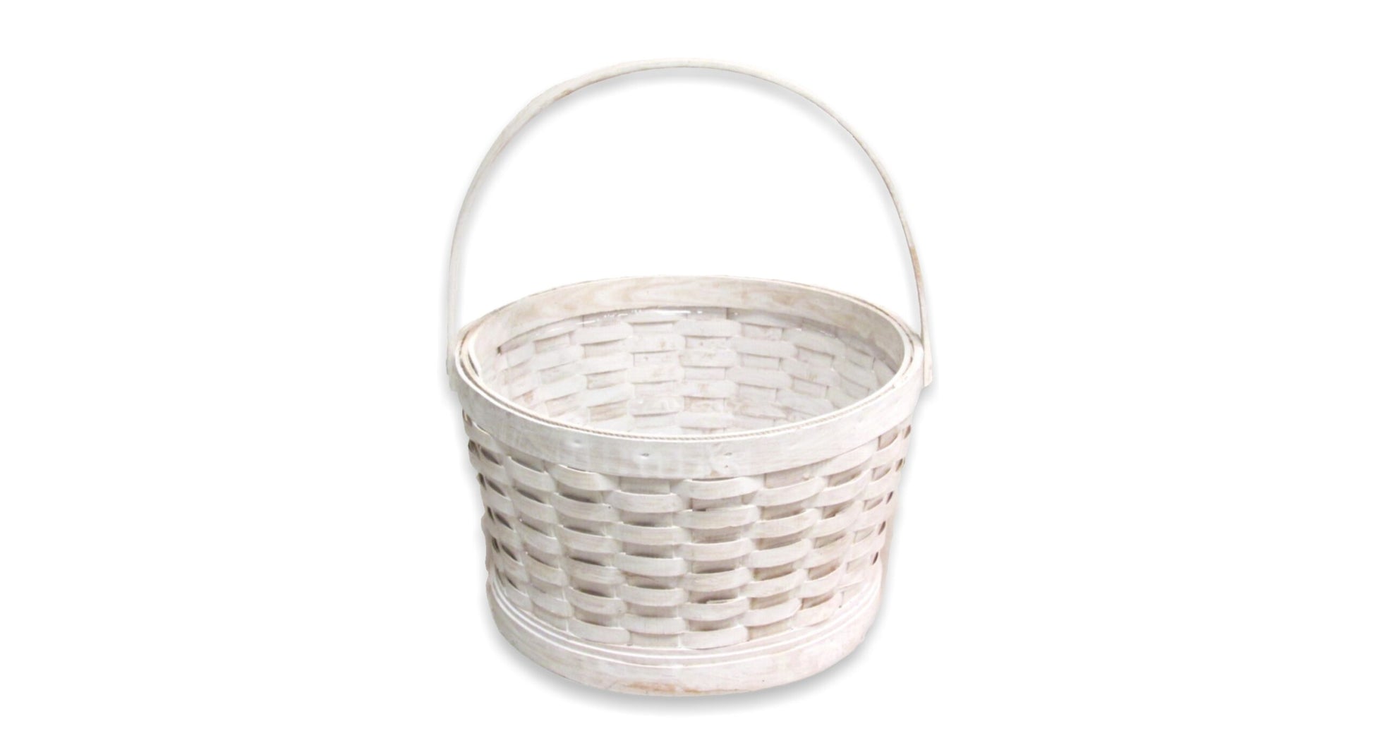Description: Whitewash plywood round 10" basket with moving handle; Comes with hard liner.