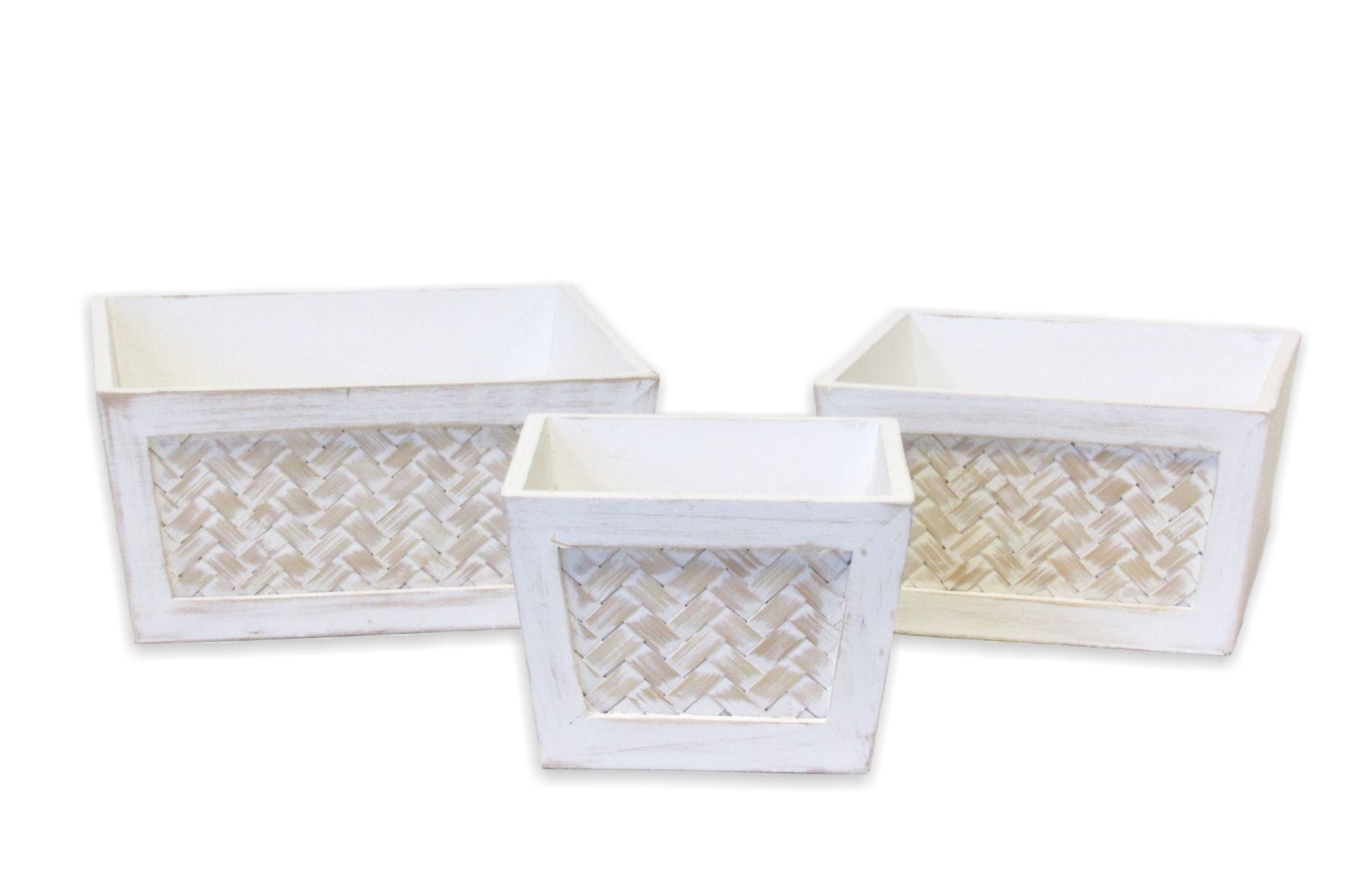 Description: Whitewash wood square planter with woven design on front; Come with hard liners.