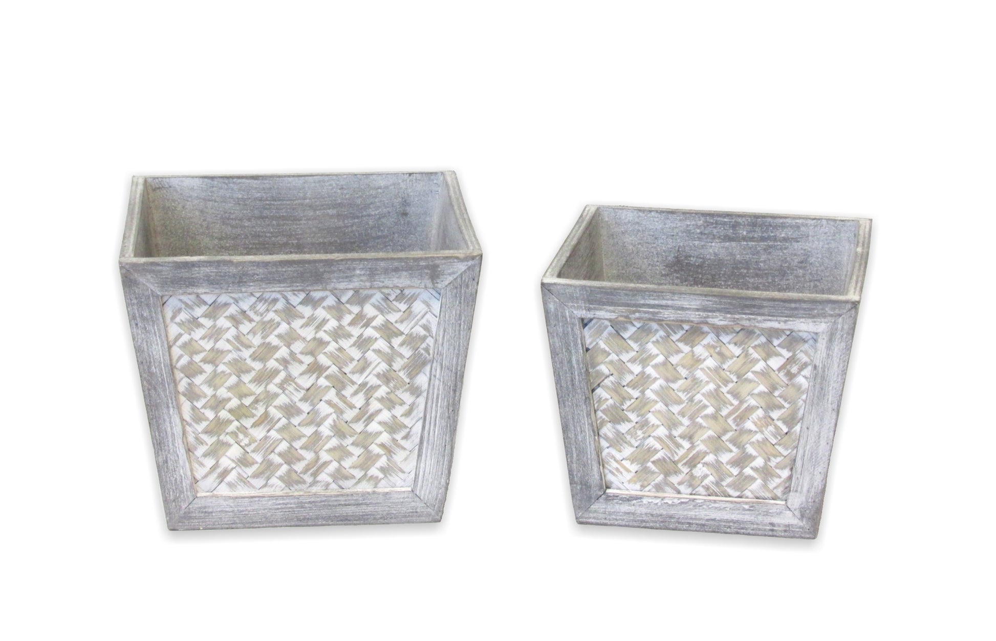 Description: Greywash wood square pots with woven design on front; Comes with hard liners.