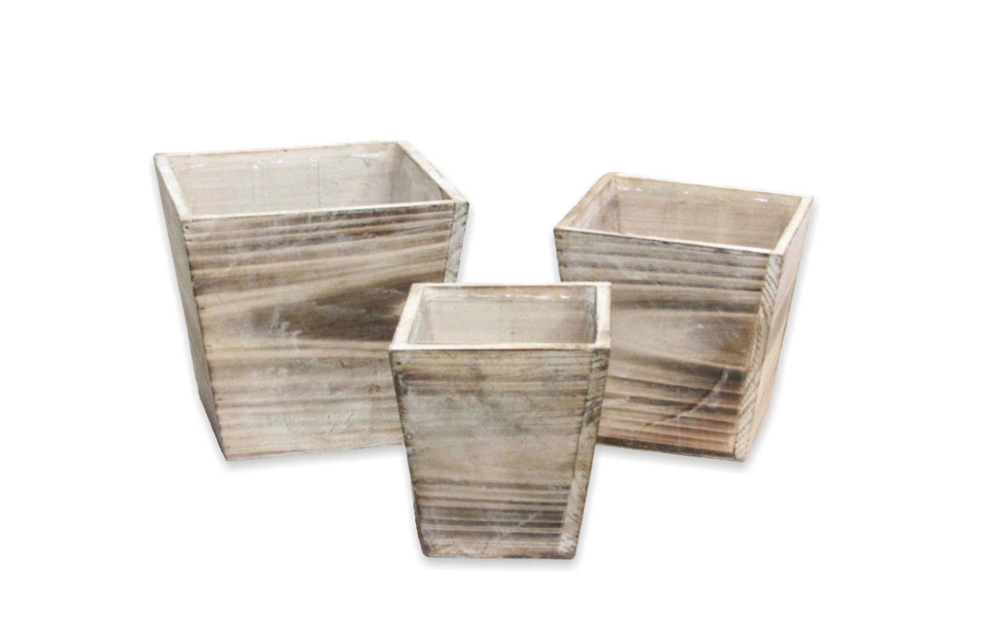 Description: Whitewash light natural wood square pots; Comes with hard liners.