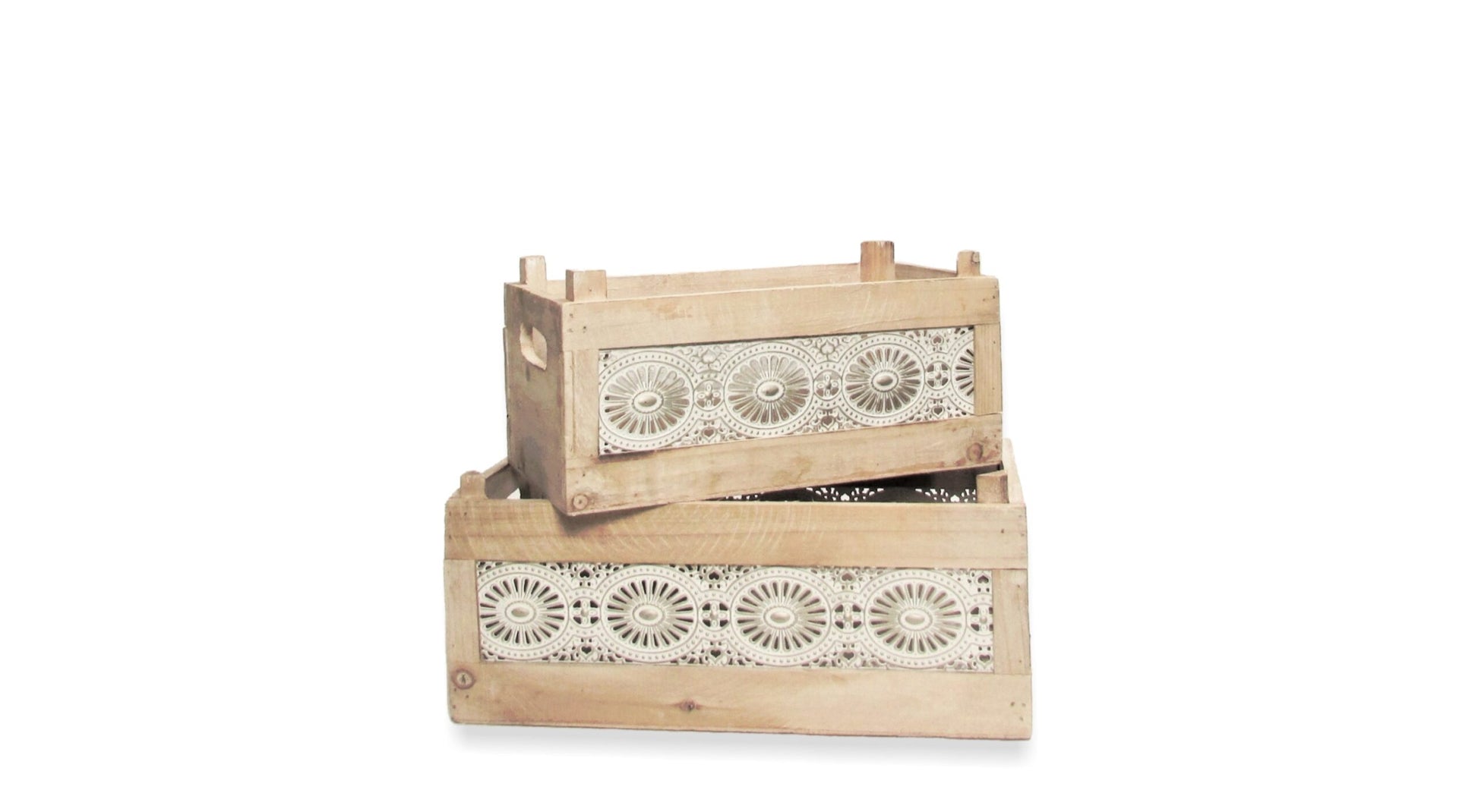 Description: Whitewash and light natural wood rectangular planters inlaid with metal design and side handles; Come with hard liners.