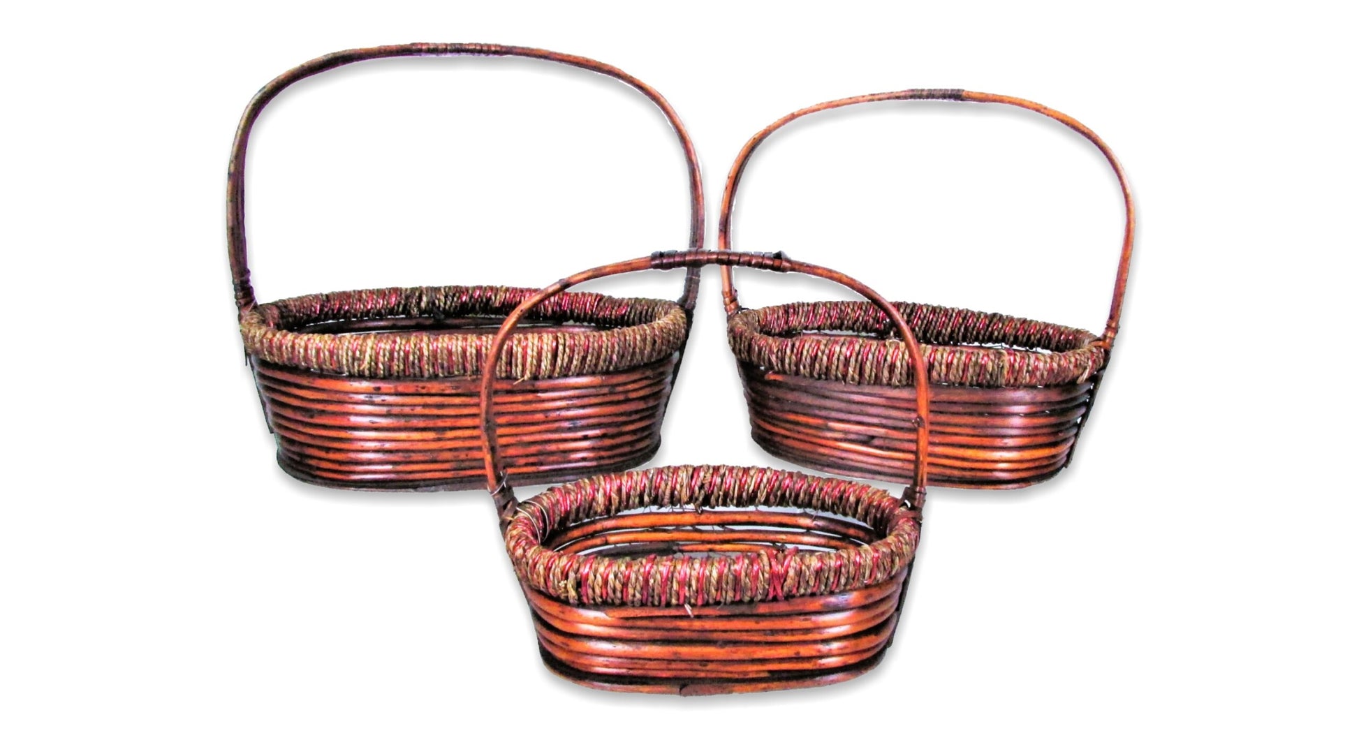 Description: Stained woody willow oval baskets with rope rim.