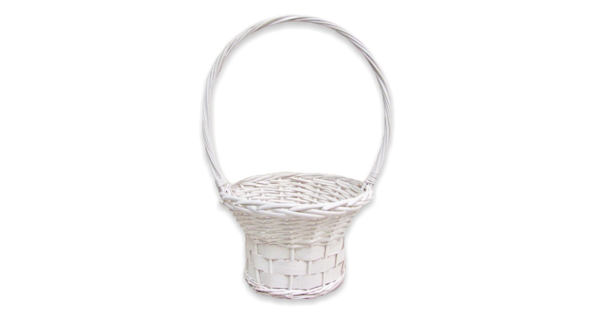 Description: White willow flower girl basket with tall handle and woven wood design.