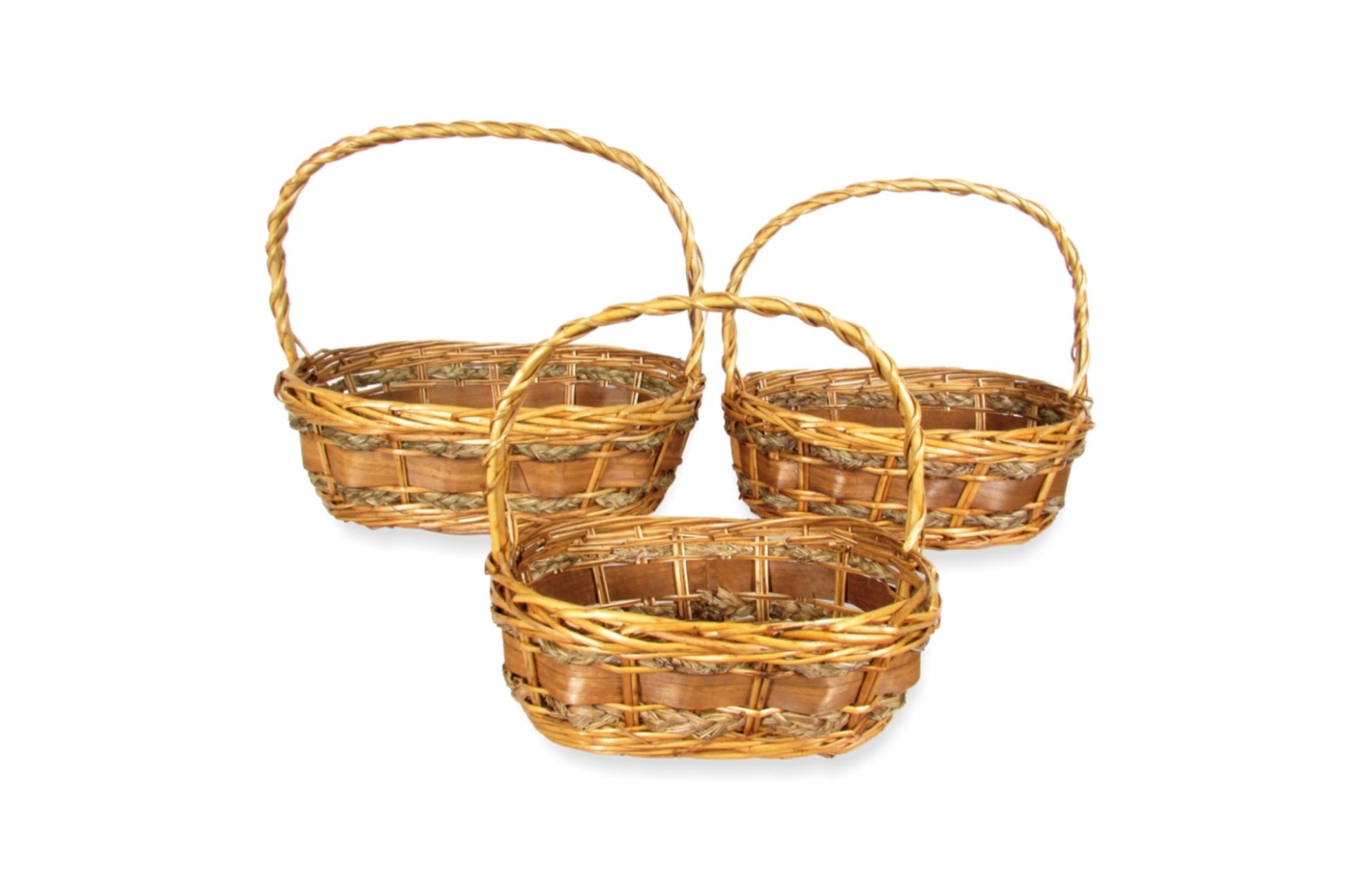 Description: Honey willow oval baskets with braided rim and wood inlay.