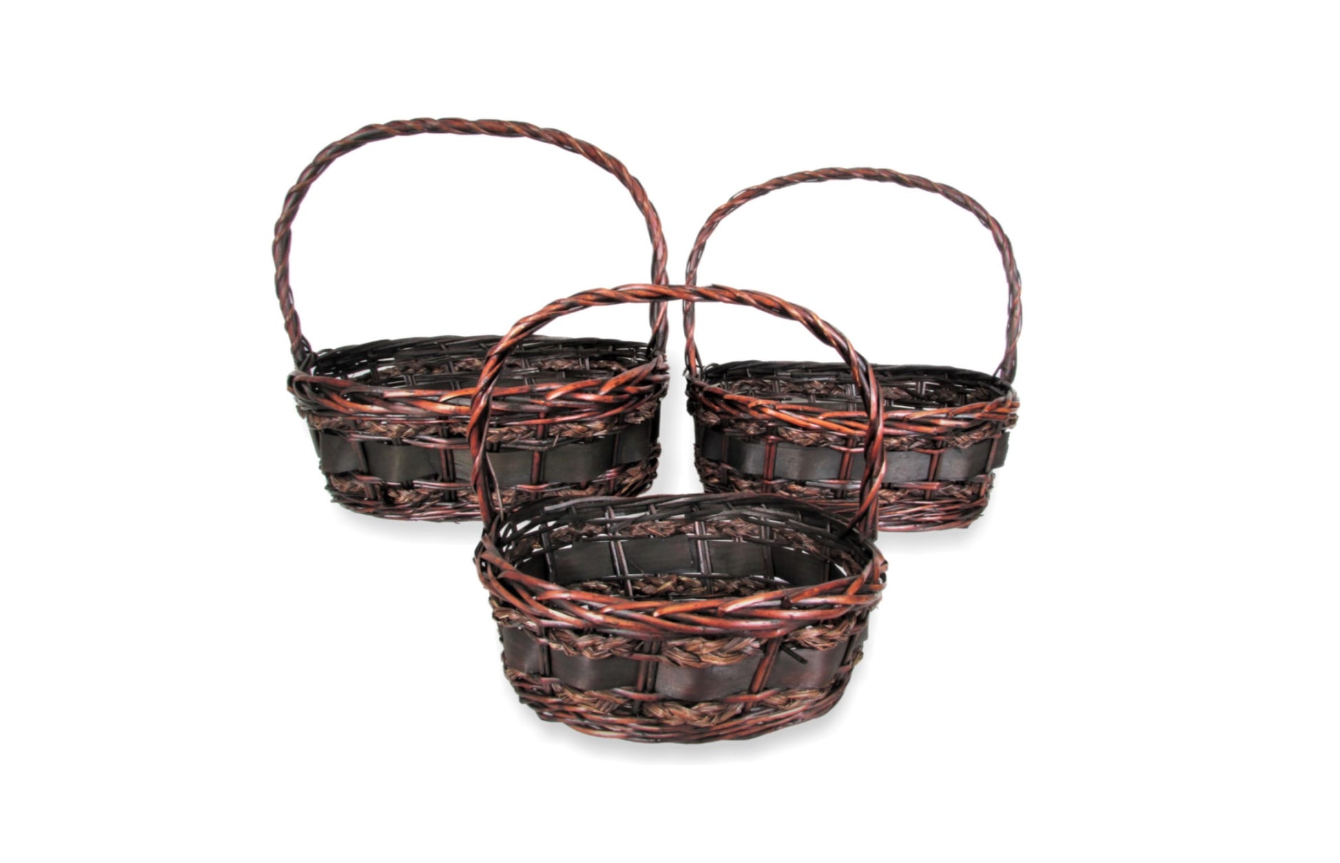 Description: Stained willow oval baskets with braided rim and wood inlay.