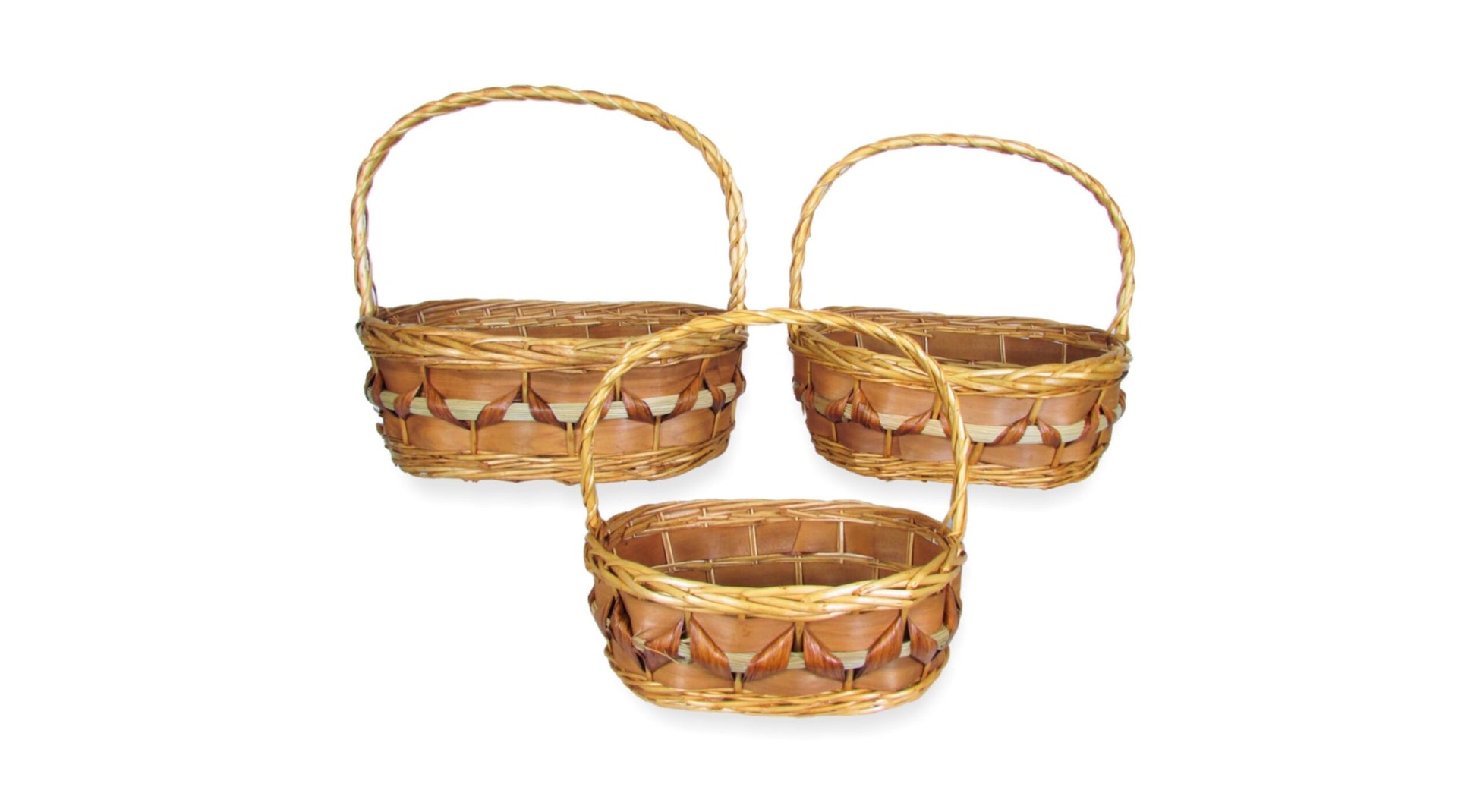 Description: Honey willow oval baskets with woody willow and straw inlay.