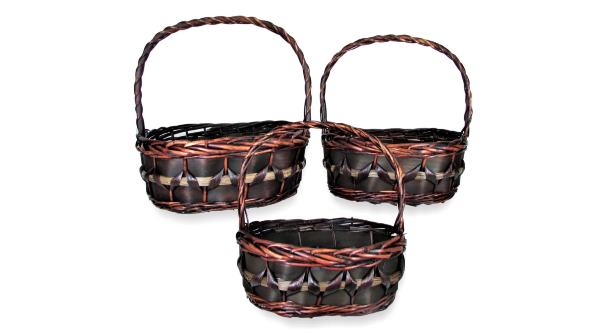 Description: Stained willow oval baskets with woody willow and straw inlay.