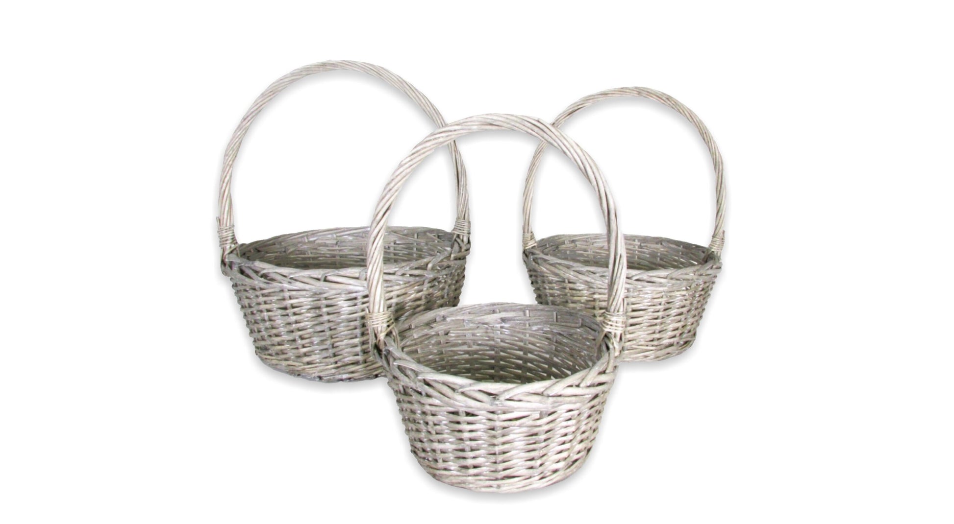 Description: Grey split willow round baskets with braided rim.