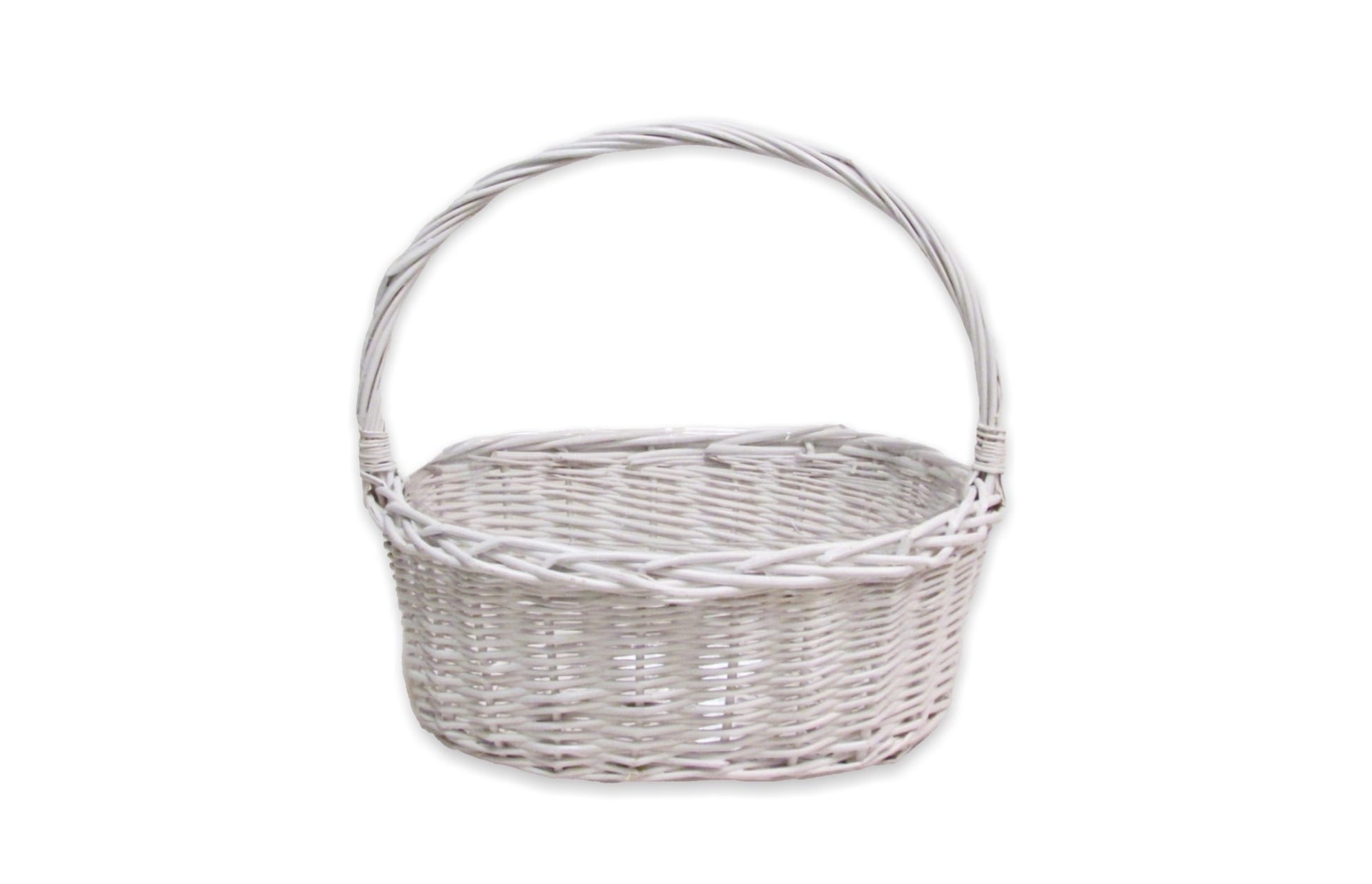 Description: White willow oval basket with braided rim; Comes with hard liner.