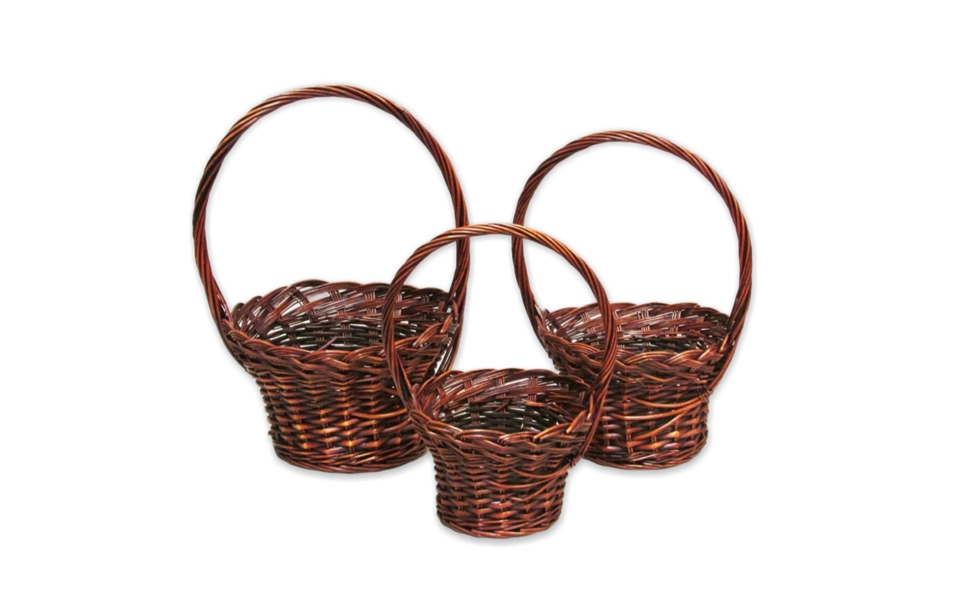 Description: Stained willow round flower girl baskets with braided flat rim and side design.