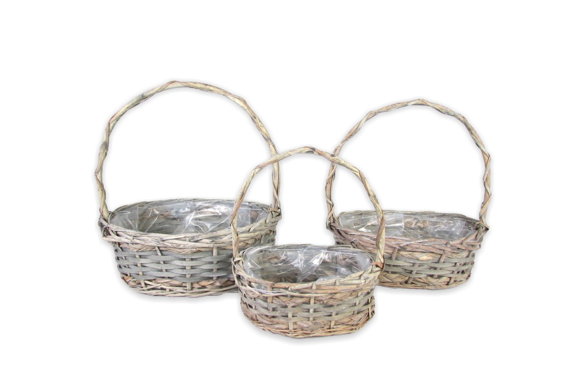 Description: WILLOW GREY WASH OVAL BASKETS WITH SOFT LINER Size: “Inches” LG- 10.5 X 8 X 4.5 X 13.5 MED- 8.5 X 6.25 X 4 X 11.5 SM- 7 X 4.75 X 3.5 X 9.5 Inside Measurements: Length X Width X Depth X Handle Height Quantity Per Package: 20 Per Case Unit: Set of 3Share