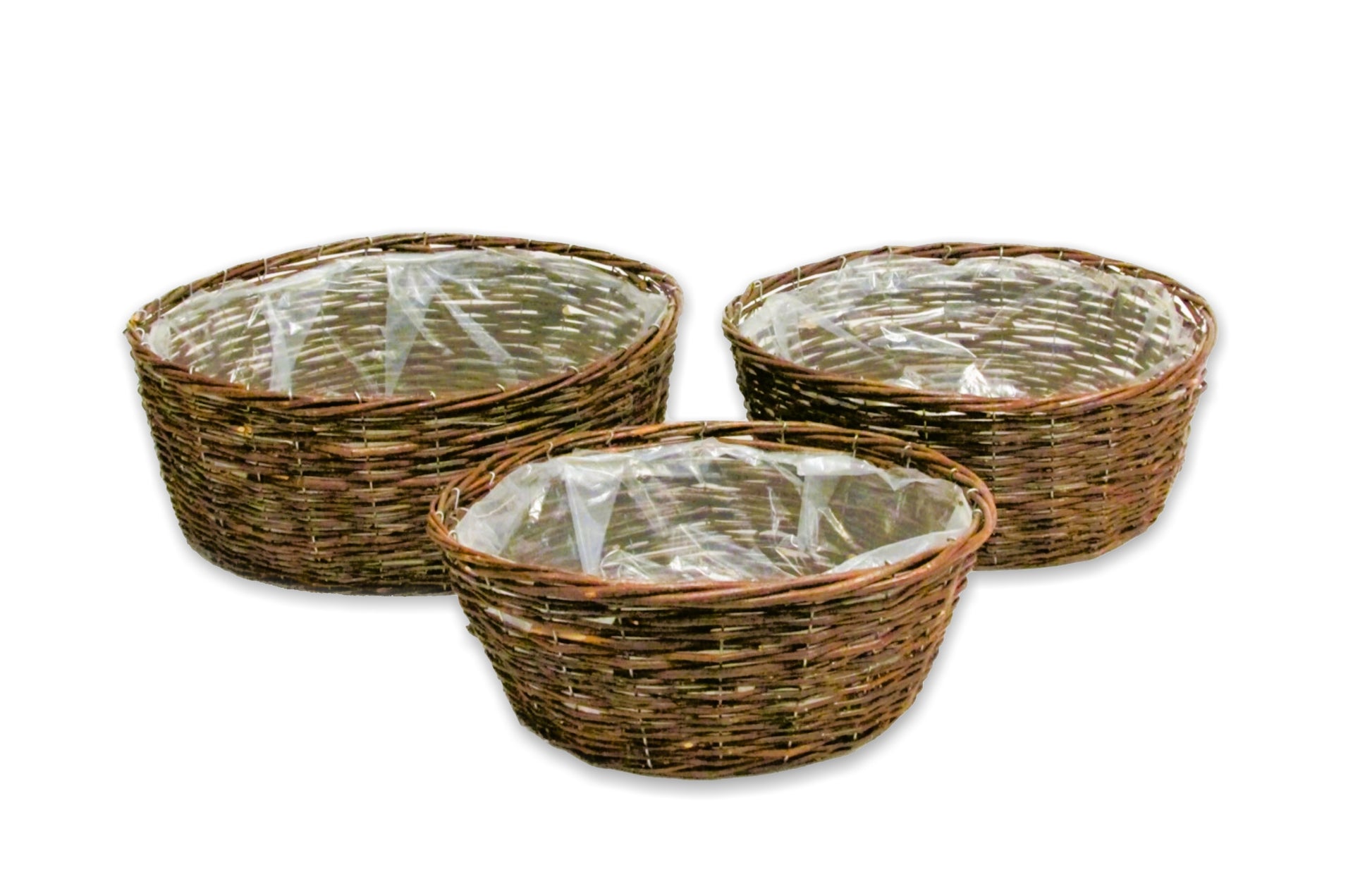 ***Liners not included, if needed extra charge*** Description: Brown willow round trays with woven wire. Size: "Inches" LG- 19 X 19 X 7.5 MED- 16 X 16 X 7 SM- 14 X 14 X 6 Inside Measurements: Length X Width X Depth Quantity Per Package: 8 Per Case Unit: Set of 3