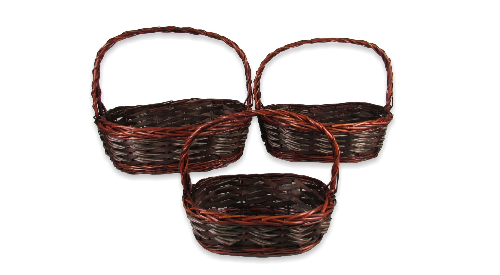 Description: SPLIT WILLOW STAIN OVAL BASKET Size: “Inches” LG – 15.50" X 13" X 6" X 16" MED – 13.50" X 11" X 5.50" X 14" SM – 11.50" X 9" X 4.50" X 12" Inside Measurements: Length X Width X Depth X Handle Height Quantity Per Package: 10 Per Case Unit: Set of 3