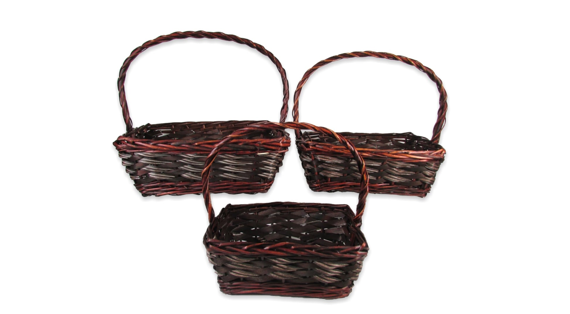 Description: SPLIT WILLOW STAIN RECTANGLE BASKET Size: “Inches” LG – 15" X 12" X 6" X 16" MED – 13.50" X 10" X 5" X 14" SM – 10.50" X 8" X 4.50" X 12" Inside Measurements: Length X Width X Depth X Handle Height Quantity Per Package: 10 Per Case Unit: Set of 3