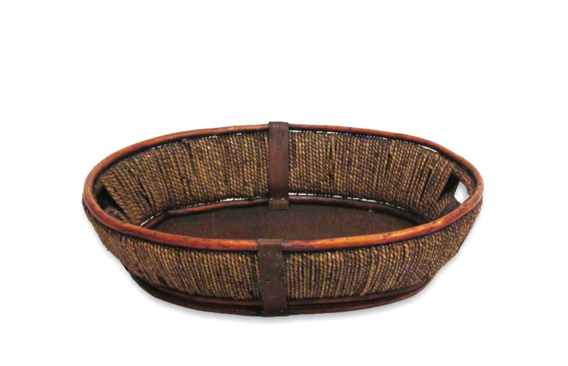 Description: Stained willow/wood/rope oval tray with side handles.