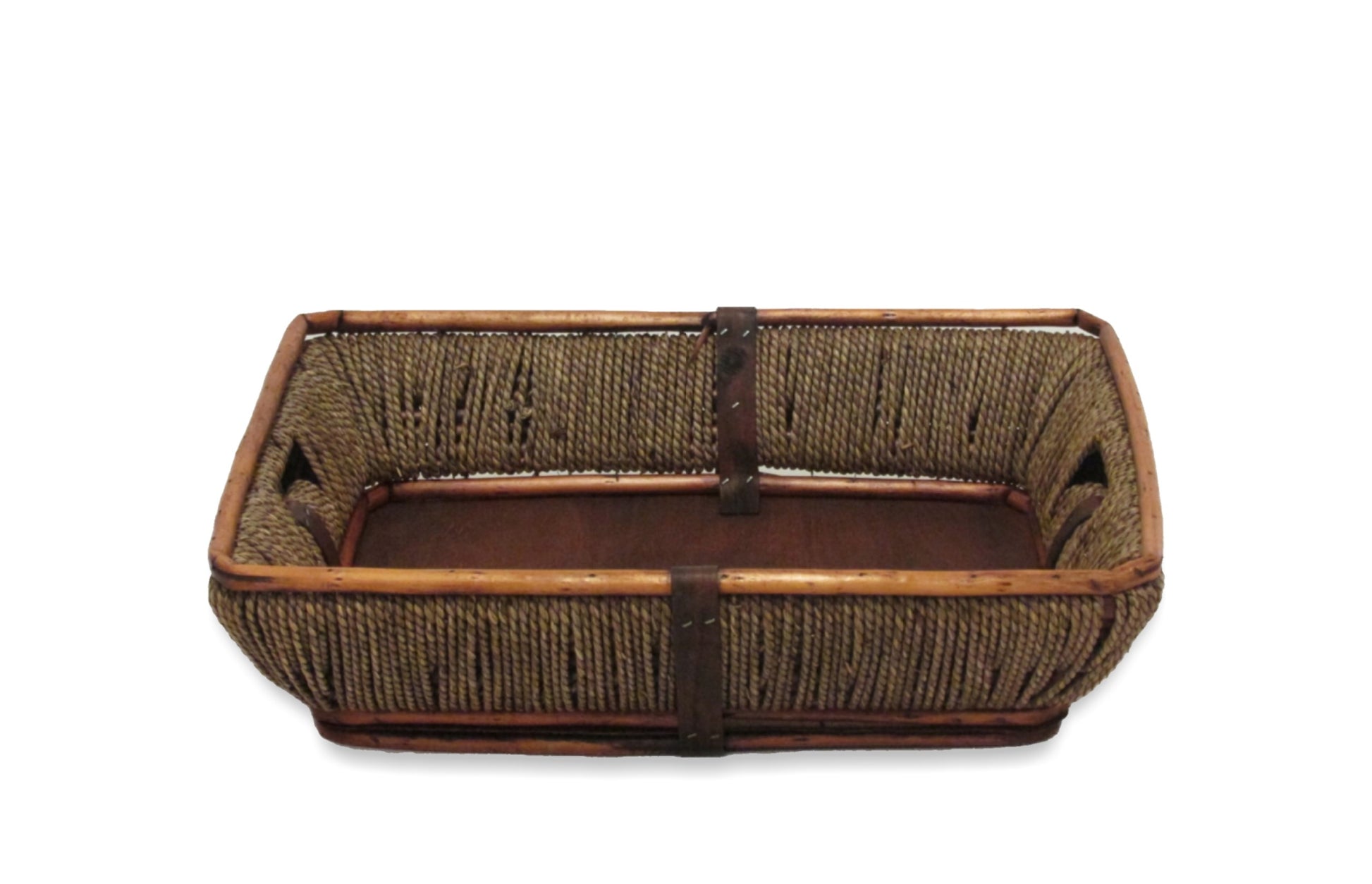 Description: Stained willow/wood/rope rectangle tray with side handles. Size: “Inches”